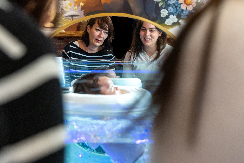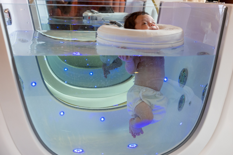 Hoe zo’n eerste sessie eruitziet? Linria straalt terwijl ze enthousiast vertelt: “De baby krijgt een speciale band om en mag dan het warme water in. Eerst rustig wennen met zachte bubbels, later met wat meer jets voor ontspanning en stimulatie. Je ziet ze ontspannen, soms vallen ze zelfs in slaap. Ouders kijken vaak vol verwondering toe. Het mooiste compliment is dat hun kindje die nacht ineens heerlijk doorslaapt, terwijl hij daarvoor telkens wakker werd.” In de gezellige ruimte klinkt rustige muziek, terwijl ouders met een kop koffie zelf ook even bijkomen. “Baby’s genieten, maar ouders net zo,” weet Linria.